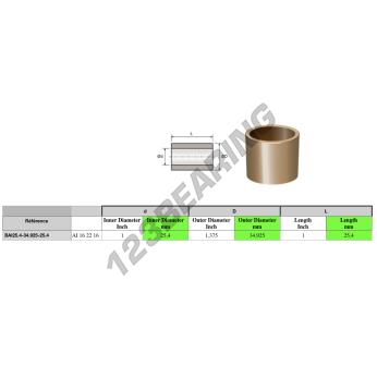 The Oil Filled Plain Bronze Bush known by the reference BAI25.400-34.925-25.400 Generic has an inside diameter of 25.4 mm, an outside diameter of 34.925 mm and a length of 25.4 mm. It is manufactured in .