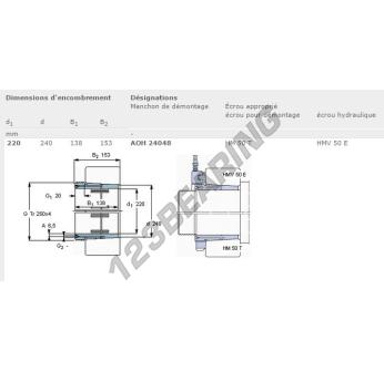 The Adapter Sleeve, known as AOH24048-SKF SKF, has an inner diameter of 220 mm, an outer diameter of 240 mm and a thickness of 138 mm.