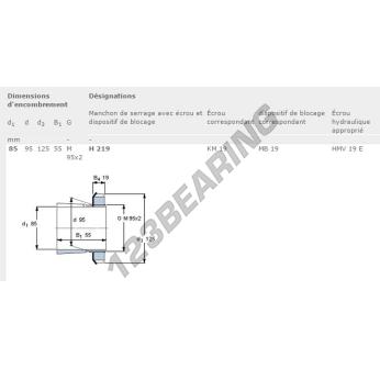 The Adapter Sleeve, known as H219-SKF SKF, has an inner diameter of 85 mm, an outer diameter of 125 mm and a thickness of 55 mm.