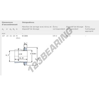 The Adapter Sleeve, known as H304-SKF SKF, has an inner diameter of 17 mm, an outer diameter of 32 mm and a thickness of 28 mm.