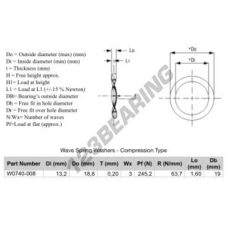 The Wave Spring Washers- Compression Type with the reference WSW-CT-18.800-13.200-0.200-3 has an inner diameter of 13.2 mm, an outer diameter of 18.8 mm and a thickness of 0.2 mm. It is made of STEEL.