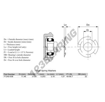The Finger Spring Washer with the reference F1240-009 has an inner diameter of 17.48 mm, an outer diameter of 31.5 mm and a thickness of 0.203 mm.