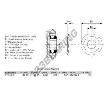 The Finger Spring Washer with the reference FSW3-29.570-10.310-0.254 has an inner diameter of 10.31 mm, an outer diameter of 29.57 mm and a thickness of 0.254 mm.