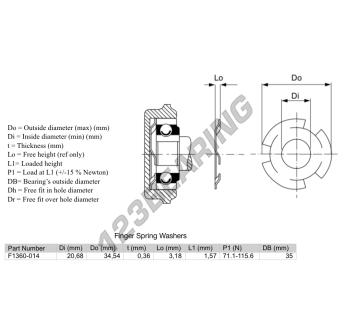 The Finger Spring Washer with the reference FSW3-34.540-20.680-0.360 has an inner diameter of 20.68 mm, an outer diameter of 34.54 mm and a thickness of 0.36 mm.