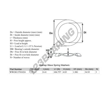 The Overlap Wave Spring Washer with the reference OWSW-34.930-27.690-0.410-3 has an inner diameter of 27.69 mm and a thickness of 0.41 mm. It is made of STEEL.