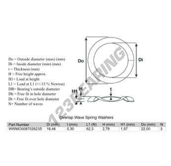The Overlap Wave Spring Washer with the reference WWMO008702623S has an inner diameter of 16.46 mm and a thickness of 0.3 mm. It is made of STAINLESS STEEL.