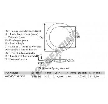 The Split Wave Spring Washer with the reference SWSW-265-244.16-0.81-9 has an inner diameter of 244.16 mm and a thickness of 0.81 mm. It is made of STEEL.
