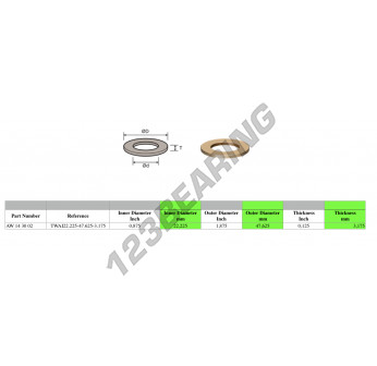 The TWAI22.225-47.625-3.175 Generic Thrust Washer measures 22.225 mm inside diameter, 47.625 mm outside diameter and 3.175 mm in thickness.