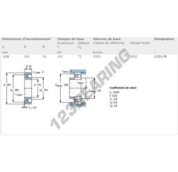 The Self Aligning Ball Bearing, known as 1322-M-SKF SKF, has an inner diameter of 110 mm, an outer diameter of 240 mm and a thickness of 50 mm.