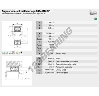 The Deep Groove Ball Bearing, known as 3304-BD-TVH-FAG FAG, has an inner diameter of 20 mm, an outer diameter of 52 mm and a thickness of 22.2 mm.