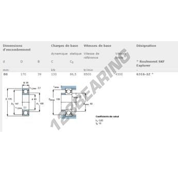 The Deep Groove Ball Bearing, known as 6316-ZZ-SKF SKF, has an inner diameter of 80 mm, an outer diameter of 170 mm and a thickness of 39 mm.