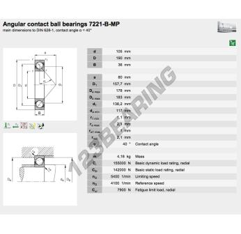 The Deep Groove Ball Bearing, known as 7221-B-XL-MP-FAG from the brand FAG, has an inner diameter of 105 mm, an outer diameter of 190 mm and a thickness of 36 mm.