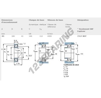 The Deep Groove Ball Bearing, known as 7317-BEP-SKF from the brand SKF, has an inner diameter of 85 mm, an outer diameter of 180 mm and a thickness of 41 mm.