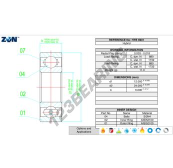The Deep Groove Ball Bearing, known as HYB-6901-ZEN from the brand ZEN, has an inner diameter of 12 mm, an outer diameter of 24 mm and a thickness of 6 mm.
