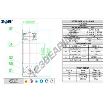 The Deep Groove Ball Bearing, known as RLS10-2Z-ZEN ZEN, has an inner diameter of 31.8 mm, an outer diameter of 69.9 mm and a thickness of 17.5 mm.