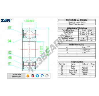 The Deep Groove Ball Bearing, known as S689-2RS-ZEN ZEN, has an inner diameter of 9 mm, an outer diameter of 17 mm and a thickness of 5 mm.
