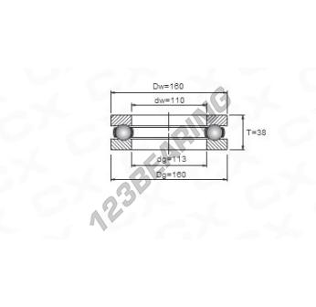 The Thrust Ball Bearing, known as 51222 Generic, has an inner diameter of 110 mm, an outer diameter of 160 mm and a thickness of 38 mm.