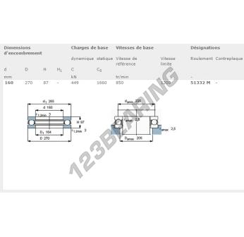 The Thrust Ball Bearing, known as 51332-M-SKF SKF, has an inner diameter of 160 mm, an outer diameter of 270 mm and a thickness of 87 mm.