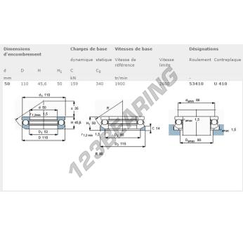 The Thrust Ball Bearing, known as 53410-SKF SKF, has an inner diameter of 50 mm, an outer diameter of 110 mm and a thickness of 45.6 mm.