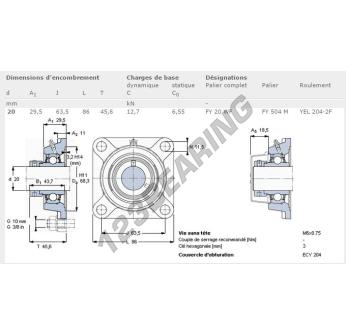 The Housed Bearing - 4 Bolts known as FY20-WF-SKF SKF has a shaft diameter of 20 mm and a fixing spacing of 63.5 mm. This part number is produced in cast iron and the tightening type is .