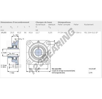 The Housed Bearing - 4 Bolts known as FY3-4-WF-SKF SKF has a shaft diameter of 19.05 mm and a fixing spacing of 63.5 mm. This part number is produced in cast iron and the tightening type is .