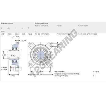 The Housed Bearing - 4 Bolts known as FY30TF-VA201-SKF SKF has a shaft diameter of 30 mm and a fixing spacing of 82.5 mm. This part number is produced in cast iron and the tightening type is .