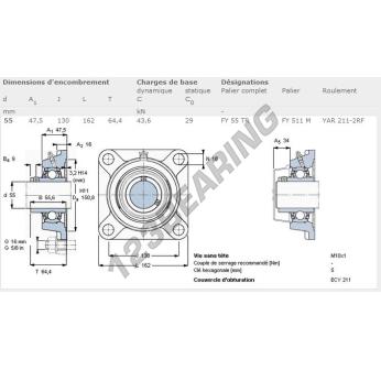 The Housed Bearing - 4 Bolts known as FY55-TR-SKF SKF has a shaft diameter of 55 mm and a fixing spacing of 130 mm. This part number is produced in cast iron and the tightening type is .