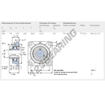 The Housed Bearing - 4 Bolts known as FYJ55-TF-SKF SKF has a shaft diameter of 55 mm and a fixing spacing of 130 mm. This part number is produced in cast iron and the tightening type is .