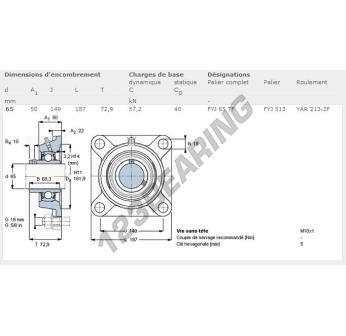 The Housed Bearing - 4 Bolts known as FYJ65-TF-SKF SKF has a shaft diameter of 65 mm and a fixing spacing of 149 mm. This part number is produced in cast iron and the tightening type is .