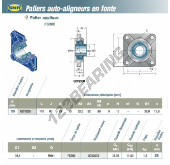 The Housed Bearing - 4 Bolts known as UCFS305-SNR SNR has a shaft diameter of 25 mm and a fixing spacing of 80 mm. This part number is produced in cast iron and the tightening type is .
