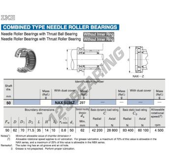 The Needle Roller And Cage Assemblies, known as NKX50Z-IKO IKO, has an inner diameter of 50 mm, an outer diameter of 62 mm and a thickness of 35 mm.