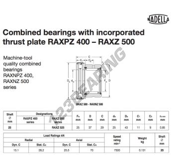 The Other Bearing, known as RAXZ525-NADELLA NADELLA, has an inner diameter of 25 mm, an outer diameter of 43 mm and a thickness of 29 mm.