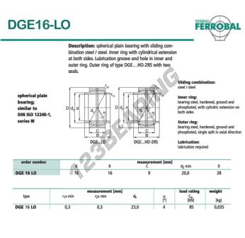 The Rod End Ge known as DGE16-LO-DURBAL DURBAL has an inside diameter of 16 mm, an outside diameter of 28 mm and a thickness of 9 mm.