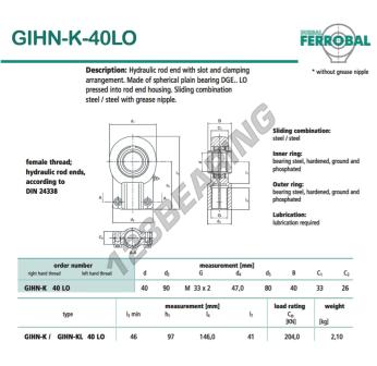 The Rod End Ge known as GIHN-K-40LO-DURBAL DURBAL has an inside diameter of 40 mm, an outside diameter of 90 mm and a thickness of 33 mm.