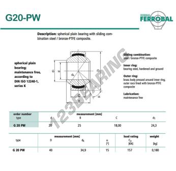 The Rod End Geew known as DG20-PW-DURBAL DURBAL has an inside diameter of 20 mm, an outside diameter of 40 mm and a thickness of 18 mm.