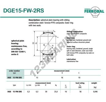 The Rod End Geew known as DGE15-FW-2RS-DURBAL DURBAL has an inside diameter of 15 mm, an outside diameter of 30 mm and a thickness of 10 mm.