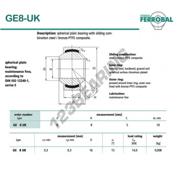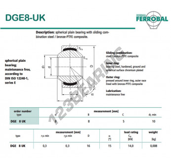 The Rod End Geew known as DGE8-UK-DURBAL DURBAL has an inside diameter of 8 mm, an outside diameter of 16 mm and a thickness of 5 mm.