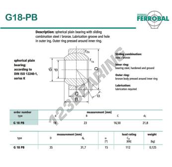 The Rod End Geew known as G18-PB-DURBAL DURBAL has an inside diameter of 18 mm, an outside diameter of 35 mm and a thickness of 16.5 mm.