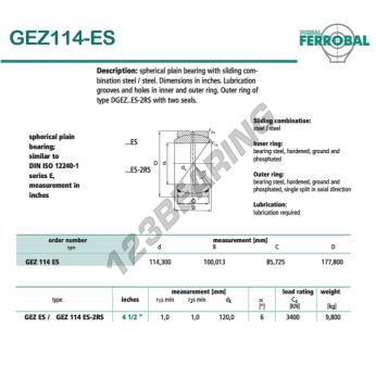 The Rod End Geew known as GEZ114-ES-DURBAL DURBAL has an inside diameter of 114.3 mm, an outside diameter of 177.8 mm and a thickness of 85.725 mm.