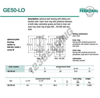 The Rod End Geg known as DGE50-LO-DURBAL DURBAL has an inside diameter of 50 mm, an outside diameter of 75 mm and a thickness of 28 mm.