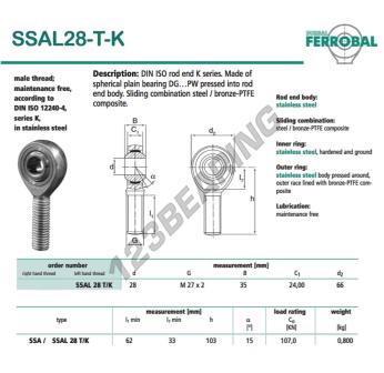 The Rod End Sa known as DSSAL28-T-K-DURBAL DURBAL has a screw thread of , an inner diameter of 28 mm, an outer diameter of 66 mm and a thickness of 35 mm.