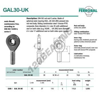 The Rod End Sa known as GAL30-UK-DURBAL DURBAL has a screw thread of , an inner diameter of 30 mm, an outer diameter of 73 mm and a thickness of 22 mm.