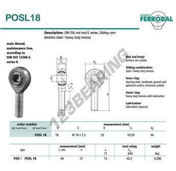 The Rod End Sa known as POSL18-DURBAL DURBAL has a screw thread of , an inner diameter of 18 mm, an outer diameter of 44 mm and a thickness of 23 mm.