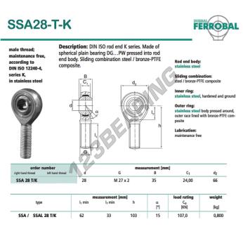 The Rod End Sa known as SSA28-T-K-DURBAL DURBAL has a screw thread of , an inner diameter of 28 mm, an outer diameter of 66 mm and a thickness of 35 mm.