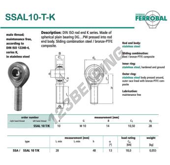 The Rod End Sa known as SSAL10-T-K-DURBAL DURBAL has a screw thread of , an inner diameter of 10 mm, an outer diameter of 28 mm and a thickness of 14 mm.