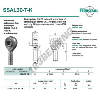 The Rod End Sa known as SSAL30-T-K-DURBAL DURBAL has a screw thread of , an inner diameter of 30 mm, an outer diameter of 70 mm and a thickness of 37 mm.