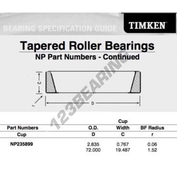 The Raw Cup, known as NP235899-TIMKEN TIMKEN, has an inner diameter of mm, an outer diameter of 72 mm and a thickness of 19.487 mm.