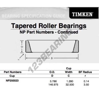 The Raw Cup, known as NP250023-TIMKEN TIMKEN, has an inner diameter of mm, an outer diameter of 146.975 mm and a thickness of 32.5 mm.