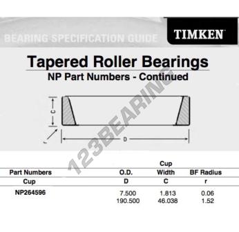 The Raw Cup, known as NP264596-TIMKEN TIMKEN, has an inner diameter of mm, an outer diameter of 190.5 mm and a thickness of 46.038 mm.