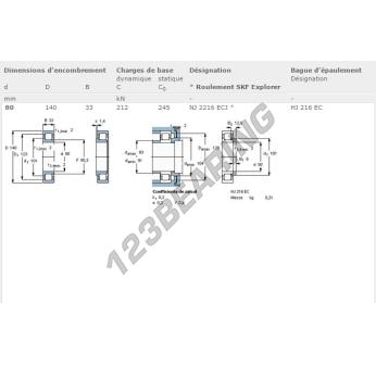 The Roller Bearing, known as NJ2216-ECJ-SKF SKF, has an inner diameter of 80 mm, an outer diameter of 140 mm and a thickness of 33 mm.